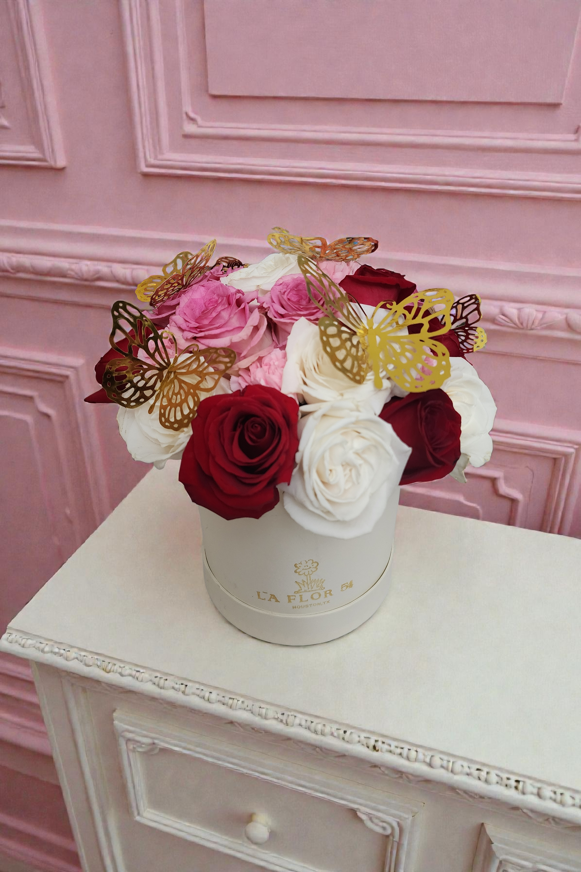 Featuring around 2 dozen fresh roses topped with golden butterflies.