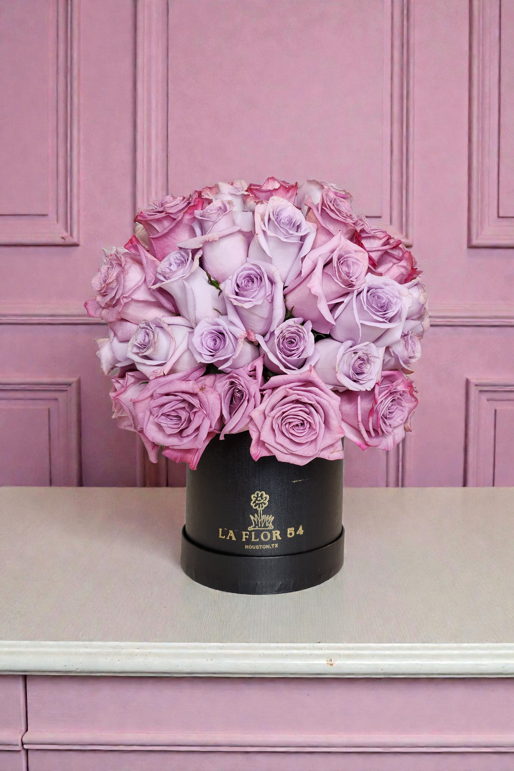 Introducing our stunning 6"x6" black lux box, with 60 plus fresh "Moody Blues" roses. Perfect for any occasion and guaranteed to make someone smile.